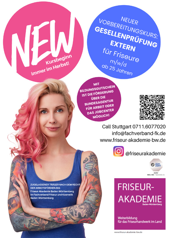 Interessentinnen und Interessenten, die mindestens 25 Jahre alt sind und Berufserfahrung im Friseurhandwerk (im Inland oder im Ausland erworben) mitbringen, können sich in der Friseur-Akademie Baden-Württemberg für den Vorbereitungskurs einschreiben. Der Vorbereitungskurs startet erstmalig am 30. September 2025 und dauert 6 Monate. Gute Deutschkenntnisse sind Voraussetzungen für die Teilnahme. Nach der intensiven Vorbereitungszeit mit simulierten Prüfungsübungen in der Friseur-Akademie Baden-Württemberg, werden die Schülerinnen und Schüler zur externen Gesellenprüfung in der Stuttgarter Berufsschule angemeldet.